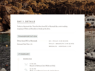 Our most basic package, The Essentials equips you with a stylized travel guide of personalized recommendations for transportation, accommodations, activities and dining.